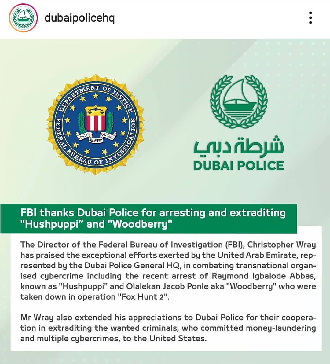 The Director of the Federatal Bureau of Investigation (FBI), Christopher Wray has praised the exceptional efforts exerted by the United Arab Emirate, represented bu the Dubai Police General HQ, in combating transnational organised cybercrime including the recent arrest of Raymod Igbalode Abbas, known as “Hushpuppi” and Olalekan Jacon Ponle aka “Woodberry” who were taken down in operation “Fox Hunt 2”.